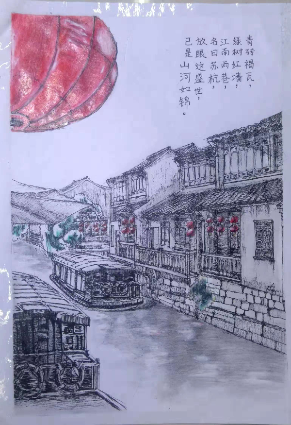 (1号作品,画者:19级国贸国际化1班刘哲宇):水波漾漾,青山相望。风欲转,柔态不胜娇。水乡的多情婉转,配合画面中灯笼的点点艳红,吴侬软语宛在耳边,水乡之柔情直击人心。画者用极其细腻的笔触勾勒出水乡的软媚,试问这样的美好山河,哪个国人不为之触动呢?
