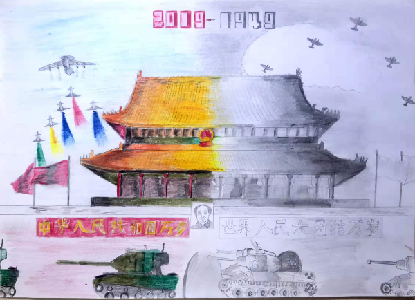 (2号作品,画者:19级国际商务2班狄锦阳):从1949中华人民共和国成立之初到2019七十周年,我们见证了中国的强大,画面从黑白转向彩色的设计独具匠心,细看更具震撼之感。这幅画构思极为精妙,生动直观的表现出了祖国翻天覆地的变化。