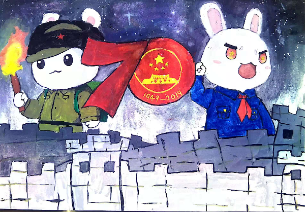 (3号作品,画者:19级经济学类7班乔婕):这幅画作取材于《那年那兔那些事》。“种花家”即为“中华家”,取其谐音。“此生无悔入华夏,来生愿在种花家”是我们每一位国人的心声.种花家从当初的一穷二白到如今在国际上举足轻重。那些曾为种花家的成长而付出巨大牺牲的兔子们,让我明白无论我们在哪里总会有一群兔子在默默守护我们。我们幸福并感激着。