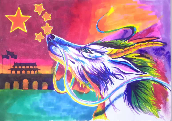 (4号作品,画者:19级国贸国际化1班王一淇):暗红色背景的天空气势恢宏,浮动着的五星红旗耀眼神圣,远处的天安门城楼遥遥矗立,这些极具代表性的象征组合在一起,震撼人心。用色大胆的巨大龙首,龙须纤毫毕现,龙眼傲世苍穹,华夏龙,中国龙,淋漓尽致的表现出了炎黄子孙的风骨。