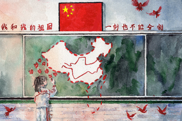 (5号作品,画者:18级经济学类2班邹陈萌):我和我的祖国,一刻也不能分割,无论我走到哪里,都留下一首赞歌。这深情的告白表达了对祖国的依恋,我们始终无法忘却这片生我养我土地。