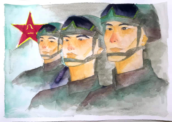 (6号作品,画者:18级经济学类4班杨丽楠):这篇画作取材于70周年阅兵仪式上精彩的一瞬,还记得当时的各大网络平台上,都被这动人一幕疯狂刷屏。刚毅的脸庞,挺拔的身姿,这群最可爱的人一直在守护者这片神圣的土地,哪有什么岁月静好,只是有他们替我们负重前行,向兵人们致敬!