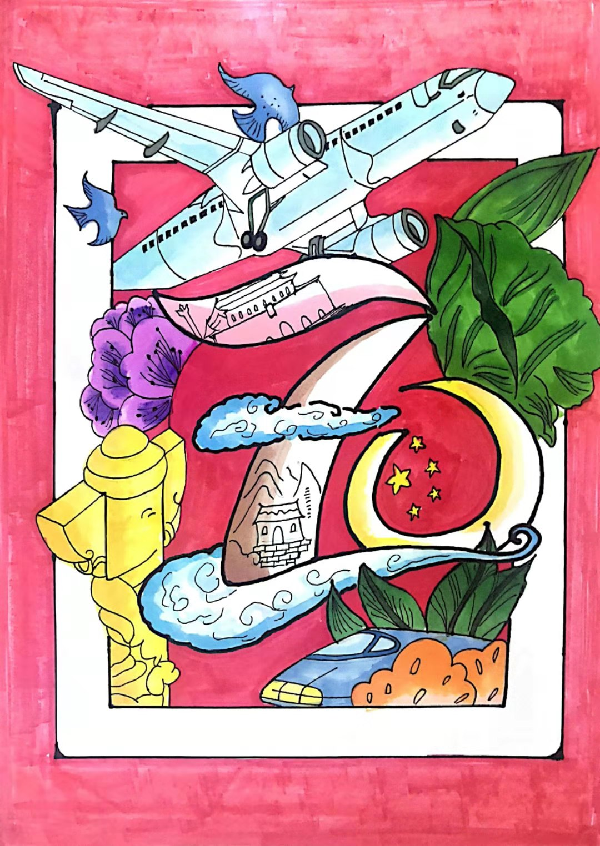 (7号作品,画者:17级经济学类1班高若轩)高铁,飞机,华表,城楼,这些极具中国特色的事物掩映在喜庆祥和的红花绿柳中,配上画面中心大大的70,表达了同学对新中国70诞辰的祝福和喜悦。