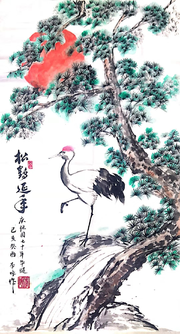 (8号作品,画者:19级经济学类1班李咏)松柏长青,代表祖国母亲跨越历史长河而不衰,屹立世界之林而不倒的坚毅。旭日东升,预示着祖国母亲将会在未来继续开创时代,引领浪潮。白鹤傲骨,表现出中国华夏民族努力拼博的傲人风采。