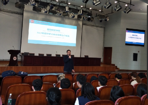 黄伟副院长介绍了大类分流的方案、分流的时间等具体安排。国贸系主任高鸣霞从课程设置、专业特点以及科创比赛等方面向学生进行了详细的专业介绍。国际经贸学院副书记、副院长饶艳对近两年的国际经济与贸易专业和经济学专业就业、考研、出国、获奖及科创等情况做了介绍,作为学生本次分流的参考。