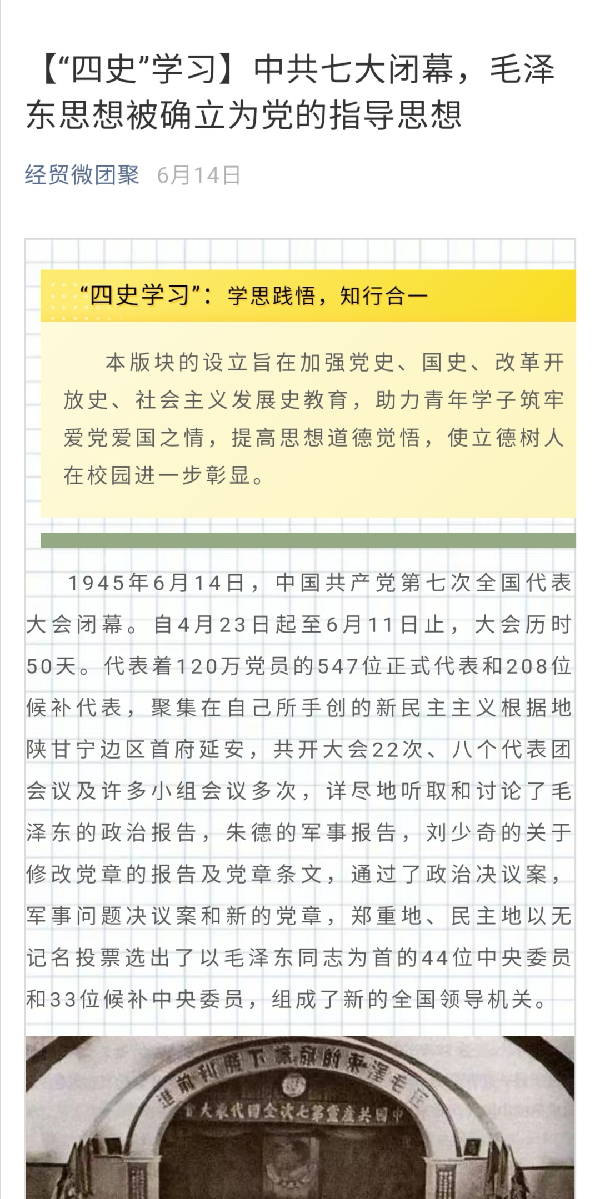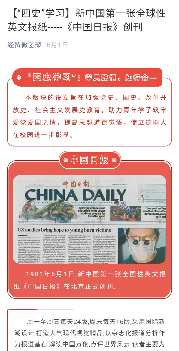 为贯彻落实上海市委、市教卫工作党委和学校党委关于“四史”学习教育的工作部署,引导学生深入学习党史、新中国史、改革开放史、社会主义发展史,进一步激发广大学生知史爱党、知史爱国的热情。国际经贸学院“经贸微团聚”微信公众号,以学思践悟“四史”学习教育专栏的形式,推送“历史上的今天”发生的具有重要纪念意义的历史事件,以史明今,让学生在学习中汲取力量,在追忆中“点燃”担当。