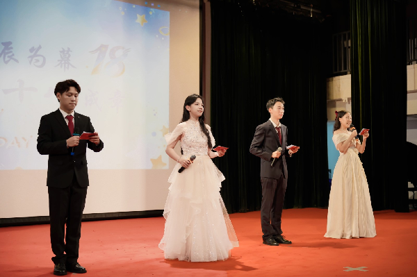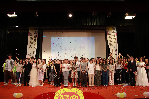 成人礼仪式中,九月份生日的新生代表们共同上台许下成年后的第一个愿望,在倒数声中吹灭蜡烛,观看远在他乡的父母为“寿星”们录制的惊喜视频。学院学生会主席高君仪学姐为新生寄语,结合自身学习经历与成长感悟,向新生传递学长学姐的关怀与期许。