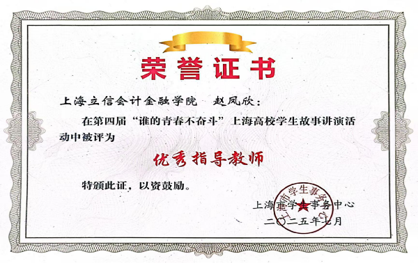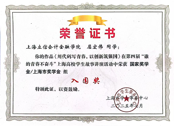 近日,由上海市学生事务中心主办的第四届“谁的青春不奋斗”上海高校学生故事讲演活动决赛落下帷幕,我院屈宏伟同学的《用代码写青春,以创新筑强国》获得国家奖学金/上海市奖学金组入围奖,赵凤欣老师获得优秀指导教师。