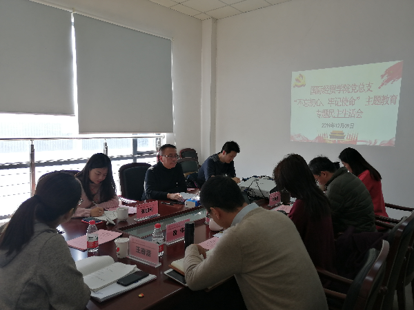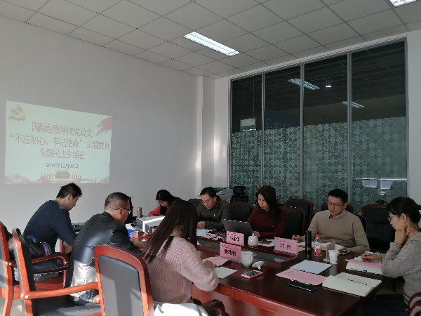 根据《上海立信会计金融学院“不忘初心、牢记使命”主题教育专题民主生活会方案》的要求,12月9日上午,国际经贸学院党总支召开“不忘初心、牢记使命”主题教育专题民主生活会。联系学院的校领导赵荣善全程参加指导,党委组织部副部长张建利、纪委办副主任胡斌出席会议。会议由学院党总支书记程振强主持,全体领导班子成员、党总支委员、专职组织员参加会议。