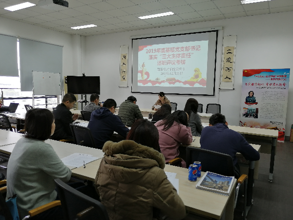 基层党支部书记述职评议考核会按照书记述职、考核打分的步骤进行。会上,学院10位党支部书记围绕意识形态、基层党建、党风廉政建设和党内监督工作依次进行了现场述职,从师德师风建设、党员思想动态、主题教育开展、政治理论学习、支部活动开展、党员教育管理等方面总结成绩,深入查找问题及原因,进一步明确努力方向。按照基层党支部述职评议考核工作要求,与会人员对各党支部书记2019年度落实“三大主体责任”工作进行了考核测评。