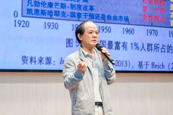 上海市世界经济学会顾问、复旦大学世界经济研究所华民教授以“极化的收入分配与无序的世界”为题,从百年巨变到百年回归的全球视野出发,回顾了资本主义两次危机的发展历程,基于马克思政治经济学、凯恩斯萧条经济学和和哈耶克货币经济学的不同理论分析框架,从收入不平等的独特视角分析了西方国家经济危机产生的根本原因。最后,他通过“钟摆原理”把西方国家解决危机的五种方案统一起来,阐述了收入分配对实现全球经济可持续增长的重要性。