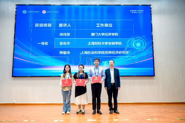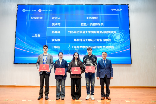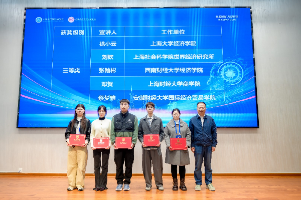 为激励在世界经济研究领域崭露头角的优秀硕、博研究生,依照惯例,本届年会开设颁奖环节。经严格评审,共评选出12篇获奖论文。其中,3名同学荣获一等奖,4名同学荣获二等奖,5名同学荣获三等奖,分别由上海立信会计金融学院党委副书记尹晨教授,上海市世界经济学会会长,复旦大学世界经济研究所所长罗长远教授,上海立信会计金融学院科研处处长万金城研究员为他们颁发获奖证书。这一环节不仅是对获奖学子学术能力的充分肯定,也体现了学界对后备力量的高度重视与殷切期望,有效营造了激励创新、奖掖后学的良好氛围。